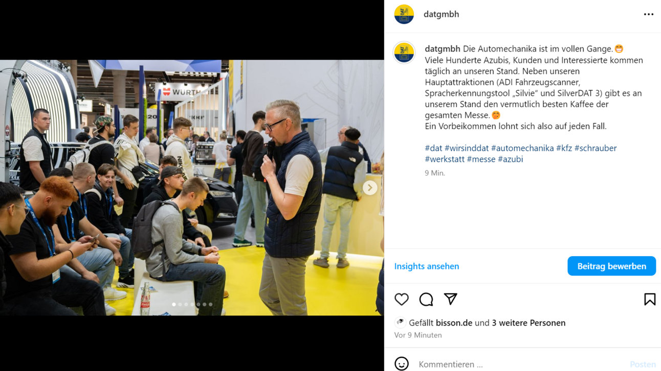 So erhalten die Azubis im Kfz-Gewerbe beispielsweise bereits seit 20 Jahren freien Eintritt auf die Automechanika, dort erleben sie DAT Produktvorstellungen, und auch das Branchenkompendium DAT Report wird ihnen kostenfrei zur Verfügung gestellt.