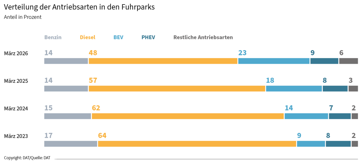 Zwar wächst der Anteil rein batterieelektrischer Fahrzeuge in den Flotten auf inzwischen 23 Prozent (32 Prozent inklusive PHEV) und etabliert sich damit als feste Größe im Fuhrpark. Gleichzeitig bleibt der Diesel mit 48 Prozent dominant. Die Realität ist also ein paralleles Nebeneinander der Antriebe – und kein schneller Umbruch.