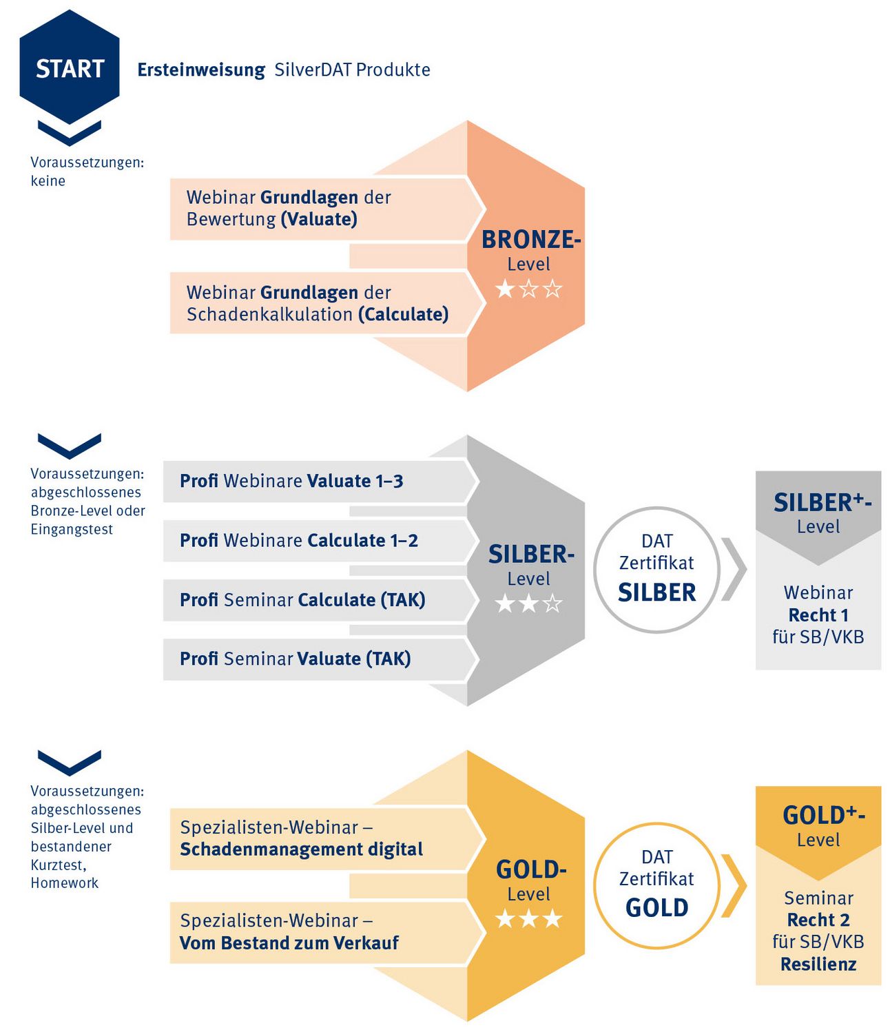 - Qualifizierung: Erhalten Sie nach jedem abgeschlossenen Level ein anerkanntes Zertifikat der DAT, um Ihre Position am Markt zu stärken.