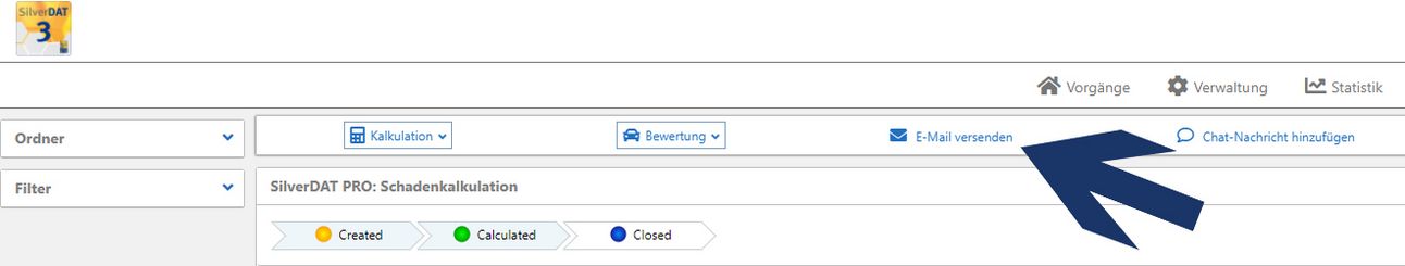 Im ersten Dropdown befinden sich die Anhangsordner des Vorgangs. Hier stehen alle verfügbaren Ordner aus einem Claim zur Verfügung, wie z.B. Schadenbilder oder Rechnungsdokumente. Im zweiten Dropdown befinden sich benutzerdefinierte Druckberichte, die von den Kunden selbst erstellt wurden. Im dritten Dropdown können Auftragsdaten in verschiedenen Ausgabeformaten oder die ADZ Datei mitgesendet werden.