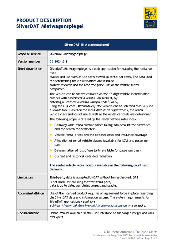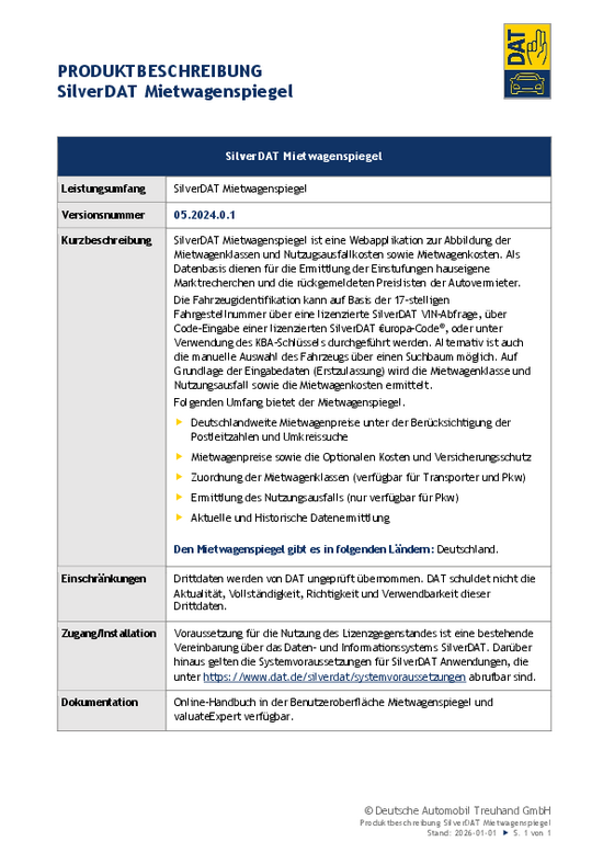 Produktbeschreibung SilverDAT Mietwagenspiegel – English version